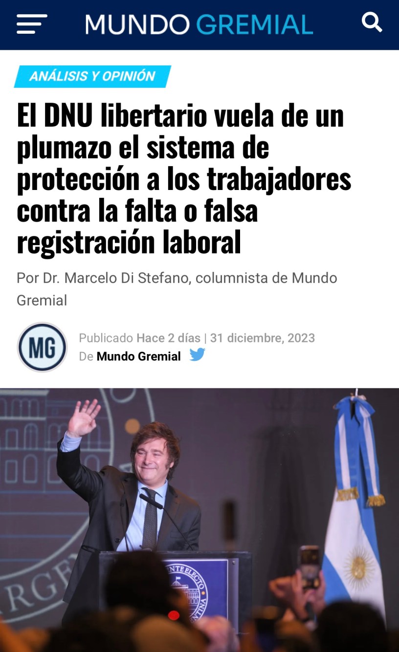 Notas de Opinión El DNU libertario vuela de un plumazo el sistema de protección a los trabajadores contra la falta o falsa registración laboral Fecha: 2 enero, 2024Autor/a: Marcelo Di Stefano El DNU libertario vuela de un plumazo el sistema de protección a los trabajadores contra la falta o falsa registración laboral Comparte: Haz clic para compartir en X (Se abre en una ventana nueva) X Haz clic para compartir en Facebook (Se abre en una ventana nueva) Facebook Me gusta Cargando...