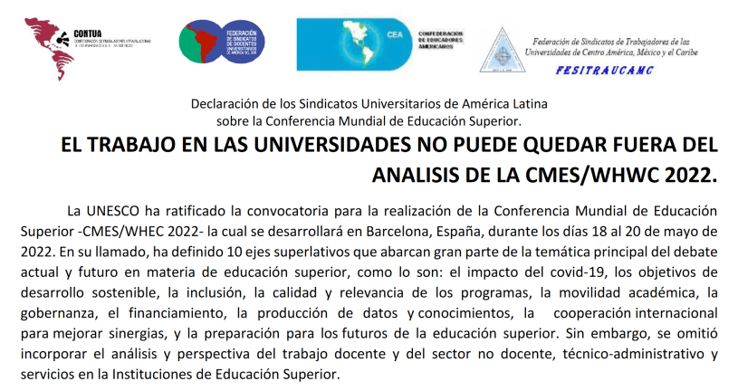 Declaración de los Sindicatos Universitarios de América Latina sobre la Conferencia Mundial de Educación Superior.